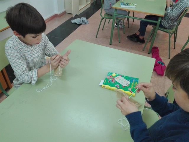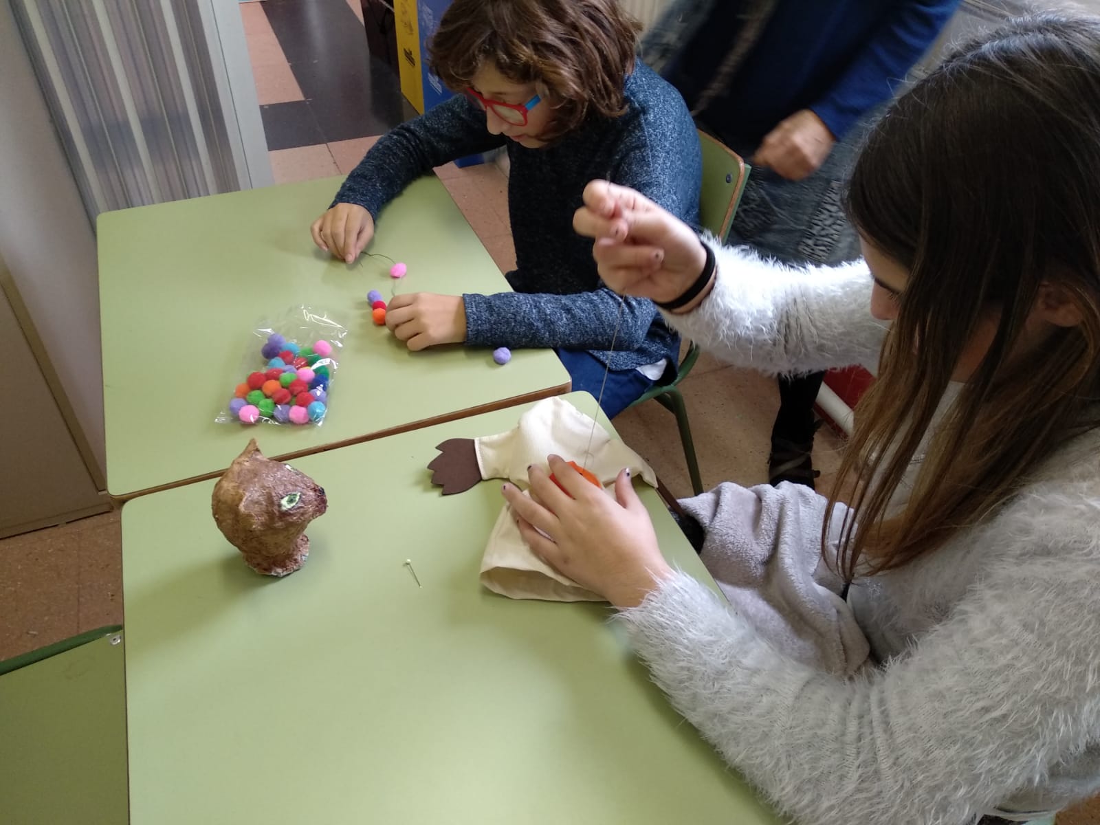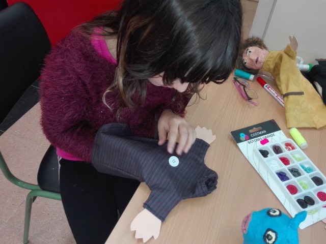 5. ¡Casi hemos acabado! Ahora nos dedicamos a coser los bonitos trajes que lucirán nuestras marionetas. Son de tela de saco y telas viejas. También se le cosen las manos que anteriormente hemos dibujado y recortado en goma-eva.