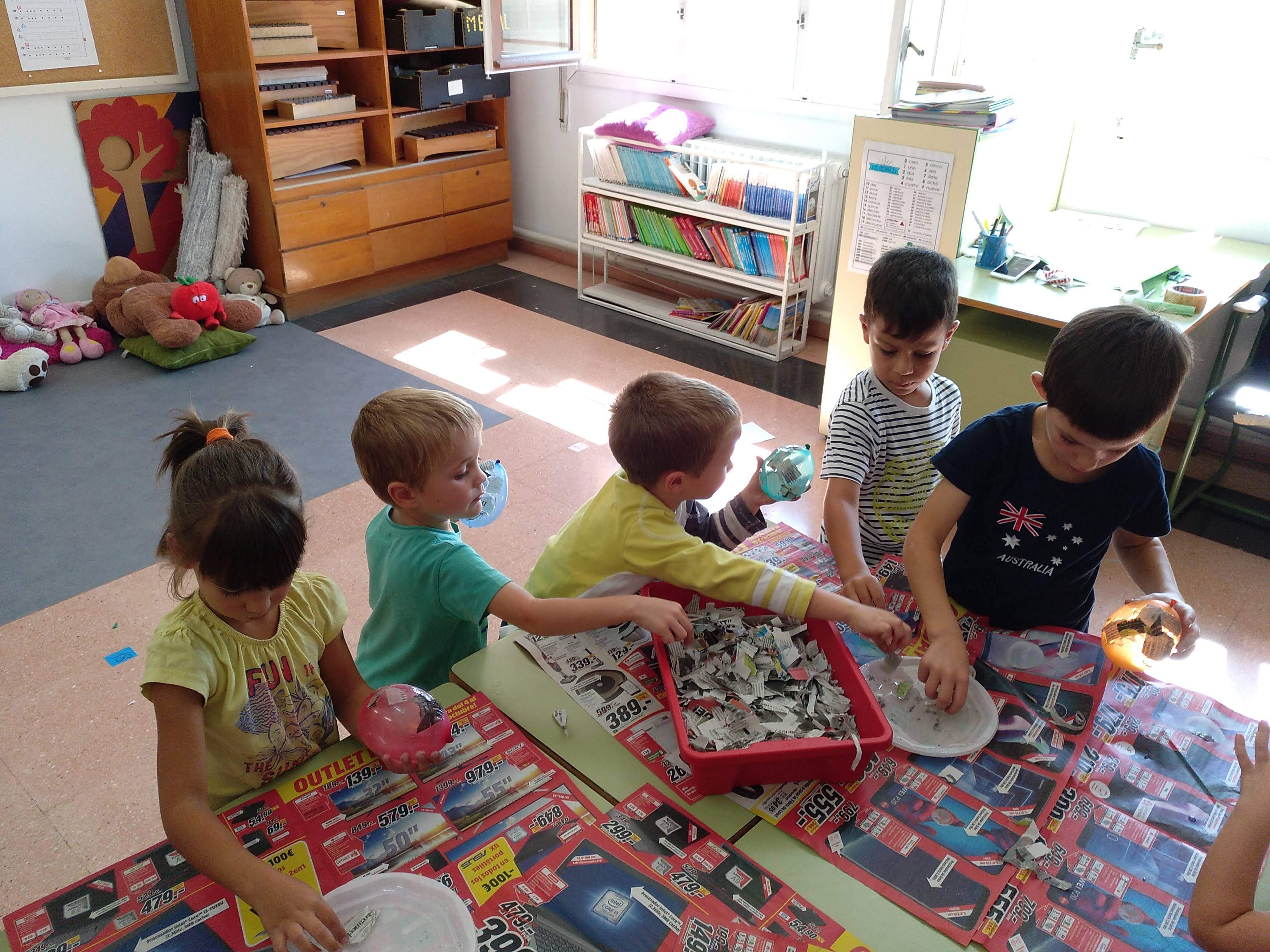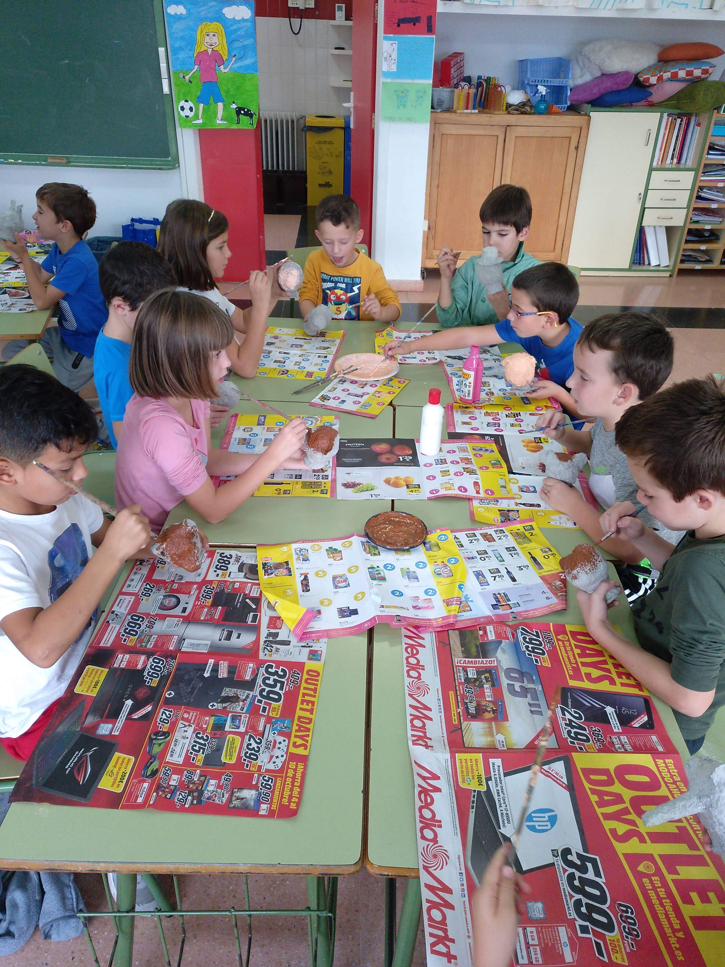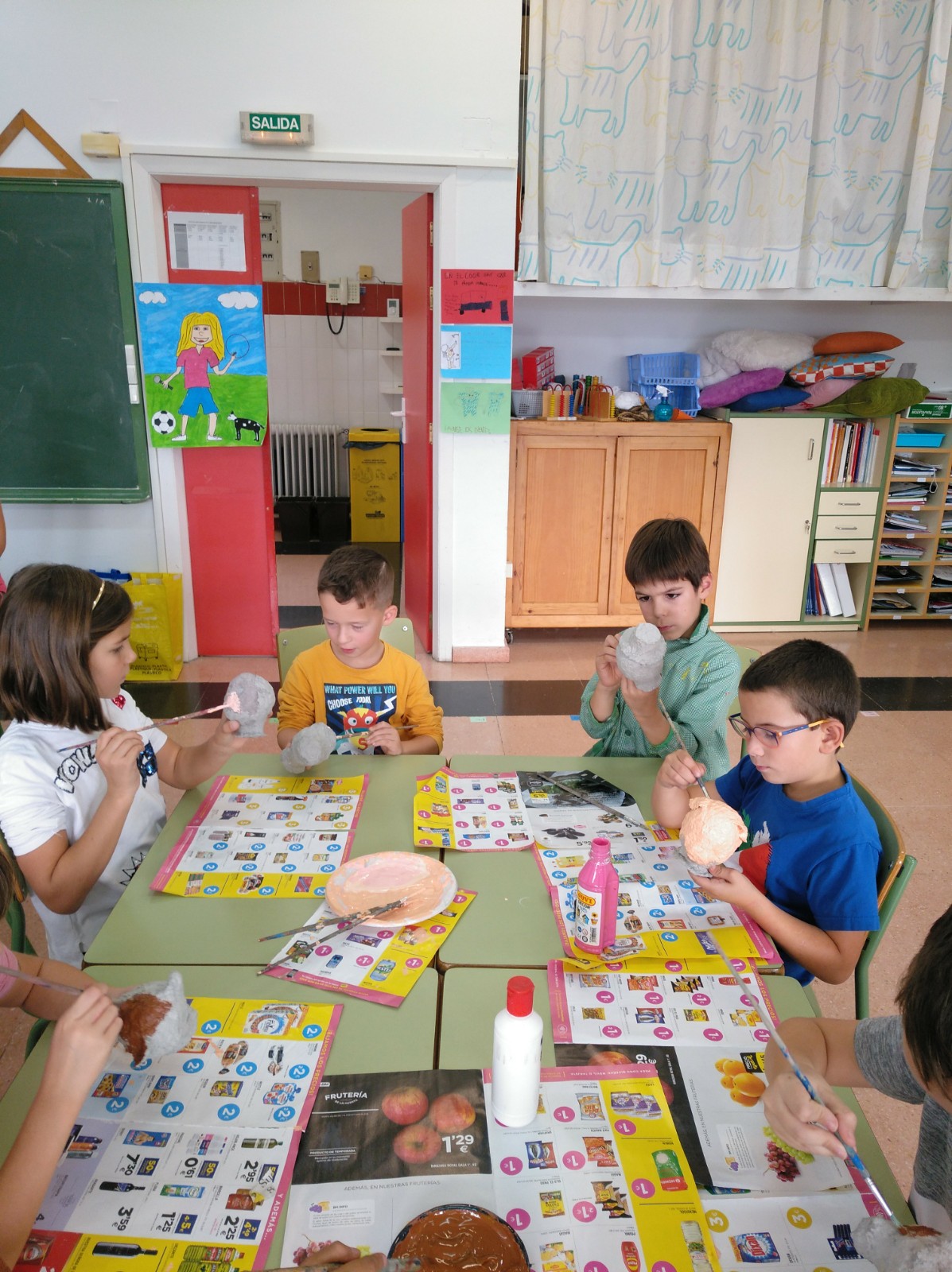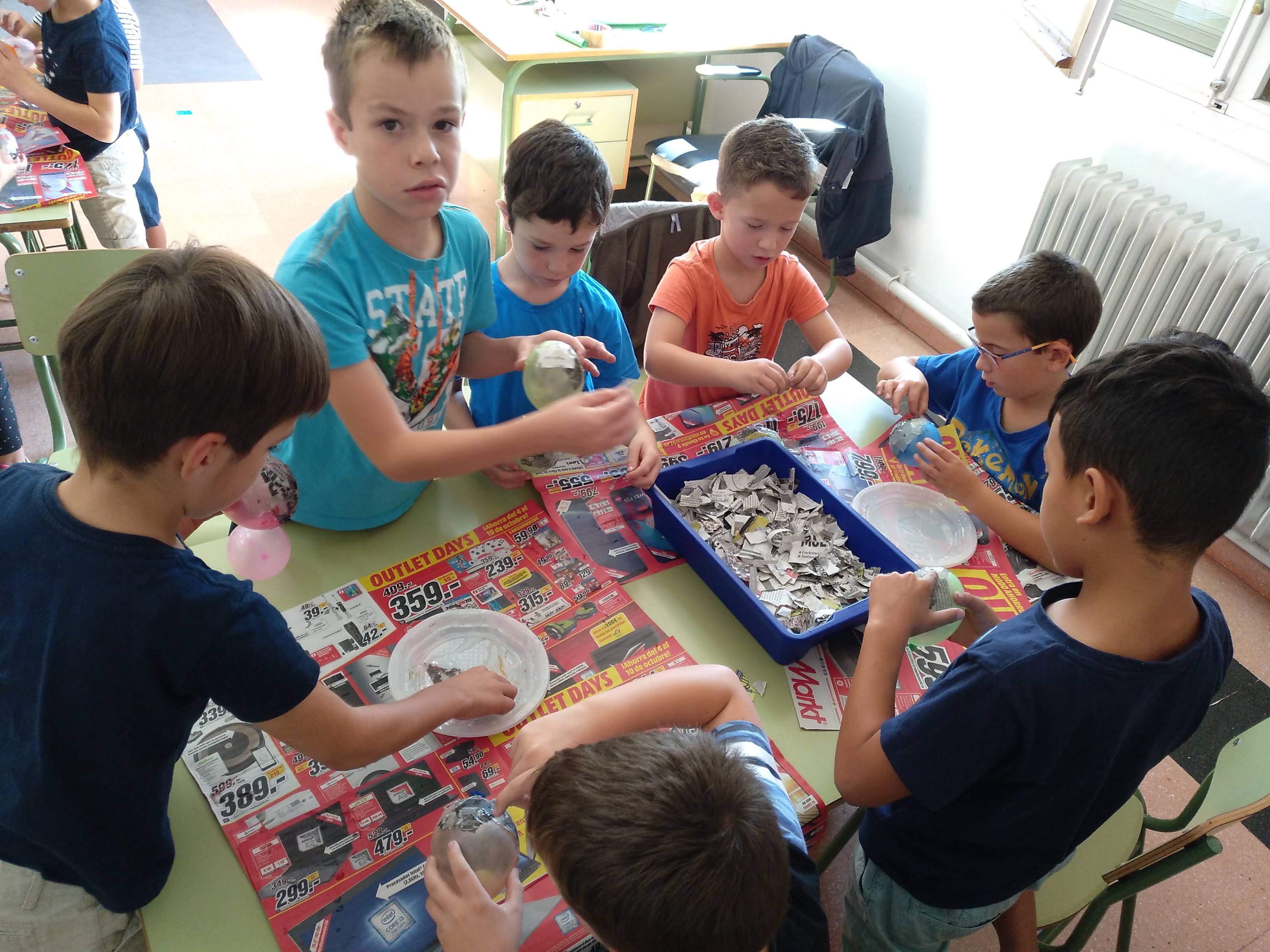 1. Se inflan unos globos y luego se cortan tiras de papel de periódico y de revistas. Hay que dar tres capas de tiras de papel bien mojadas en cola diluida en agua. Una capa de periódico, una de revistas y otra de periódico. Y luego, dejamos secar durante un día.